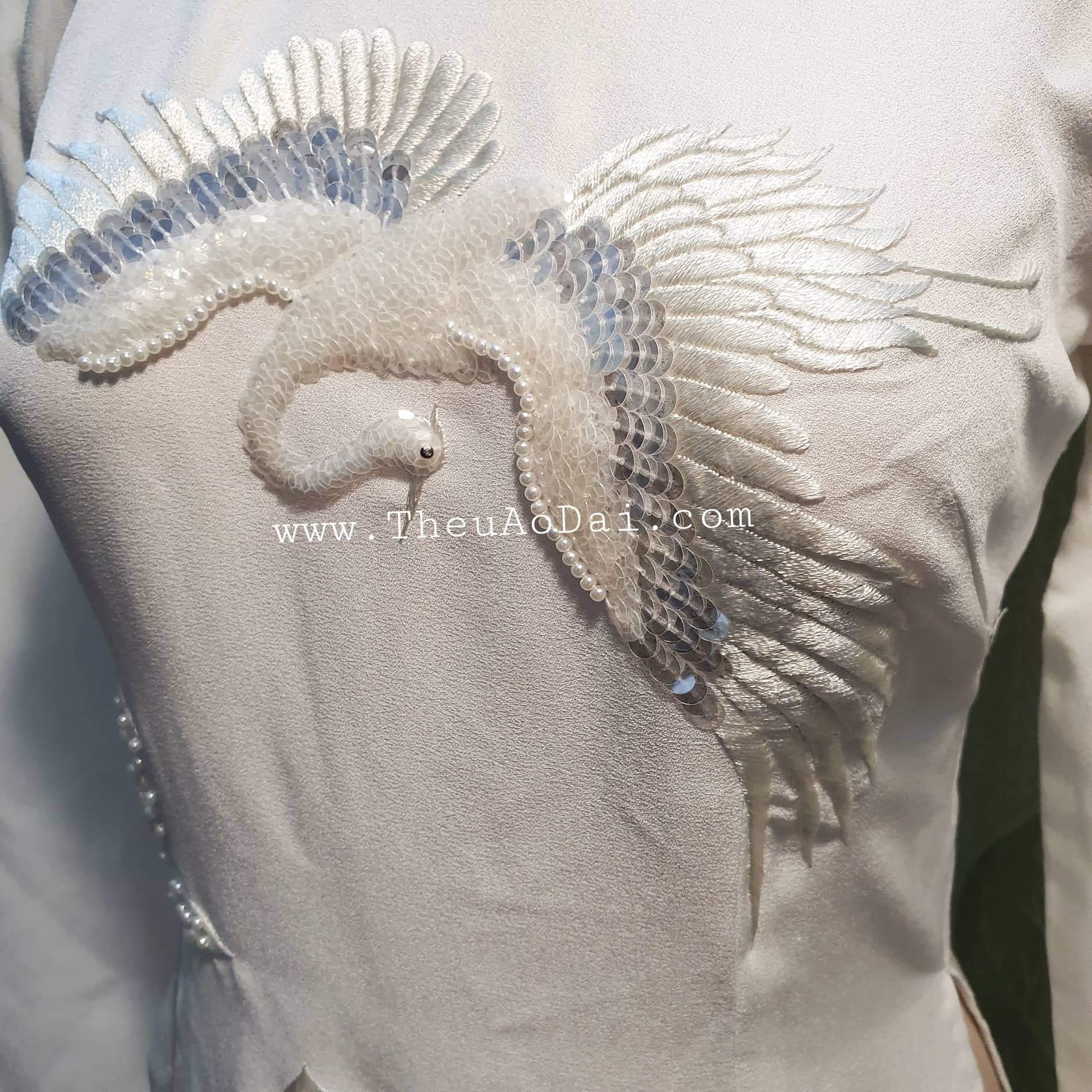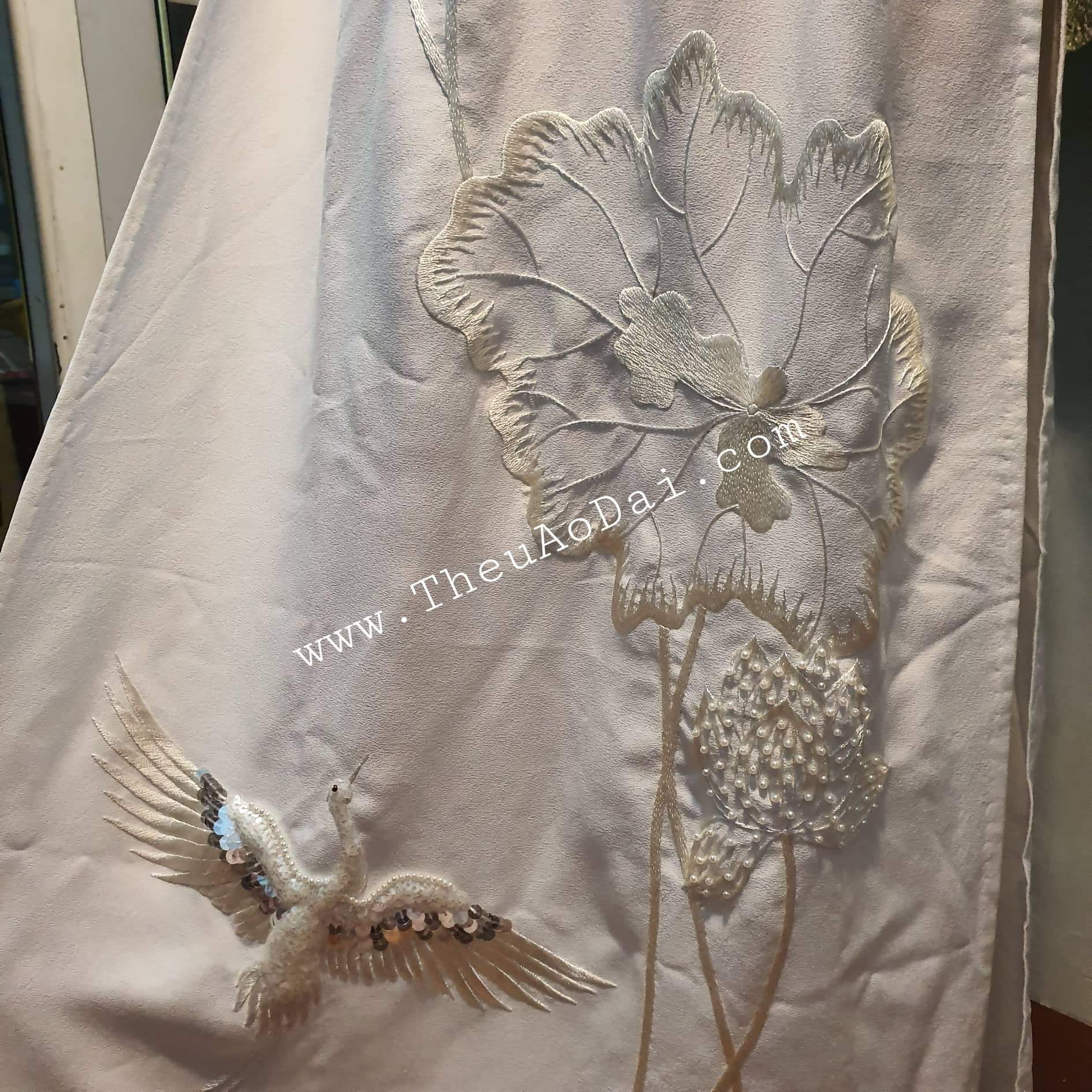 • Sản phẩm: Mẫu áo dài cưới thêu đính kết hoa sen và chim hạc